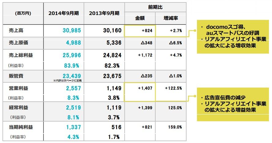 2013年9月期の営利が11億4900万円なので、前期比で大幅に増益となった。営利率は昨期の3.8%から大きく改善した。