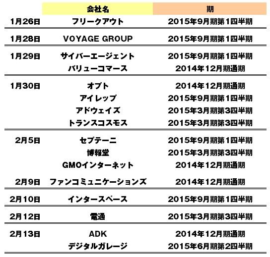 29~30日は注目する方も多い、サイバーエージェント、アドウェイズと続きます。月初を挟んで、2/5からセプテーニ、ファンコミ等、2/12には電通。といったスケジュールとなっております。
