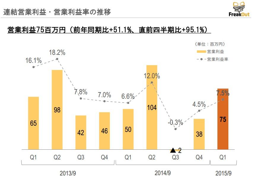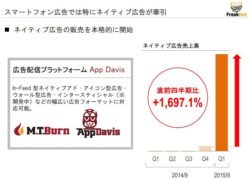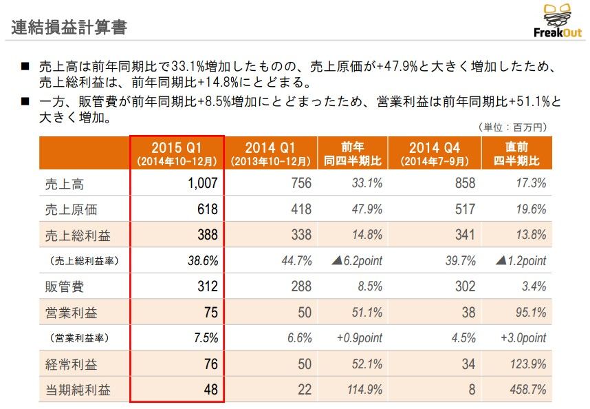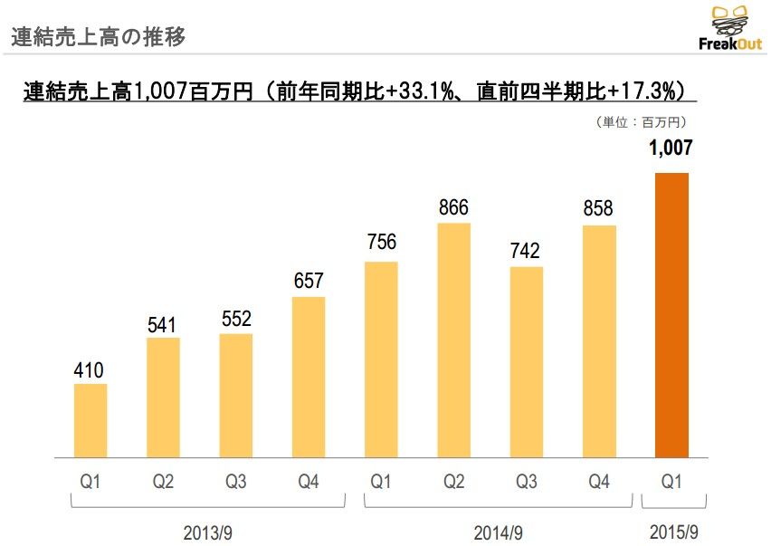 2014年4月に上場したフリークアウトも、まもなく上場から1年。3年後の売上高100億円を中期的な目標に掲げ、今期は売上高40億円の達成に向けて、まず1Q良い出だしを切ったのではないでしょうか。