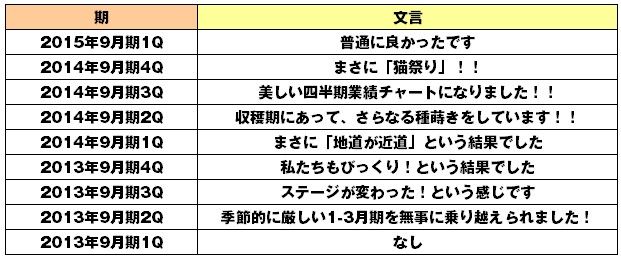 この一言コメントが始まったのは、2013年9月期2Qから。2014年9月期1Qの”まさに「地道が近道」という結果でした”とか良いですよね。今後もこの一言も楽しみの一つとして、決算説明書を見ていきたいと思います。