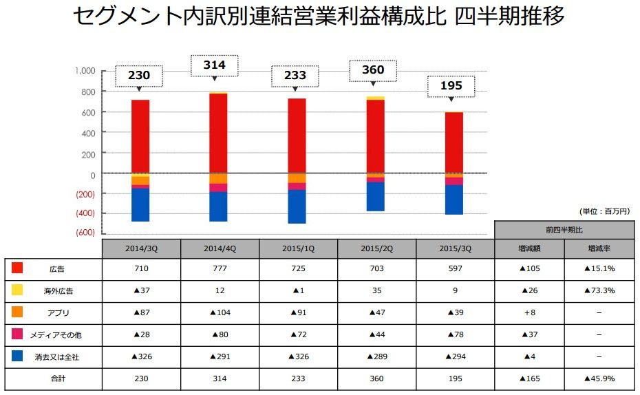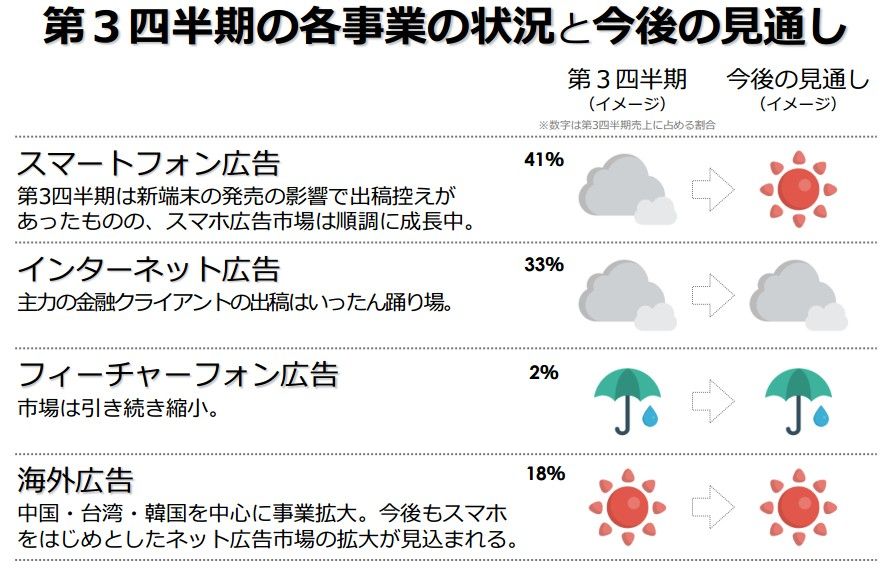 今回の決算資料から天気予報的なのが出てます。わかりやすいですね。3Q落ち込んだ国内スマホ広告だが、今後は晴れの見通し、PC・ガラケーは引き続き粛々と。海外は先述したように、中台韓を中心に伸長する見込みで、晴れが続くでしょう。