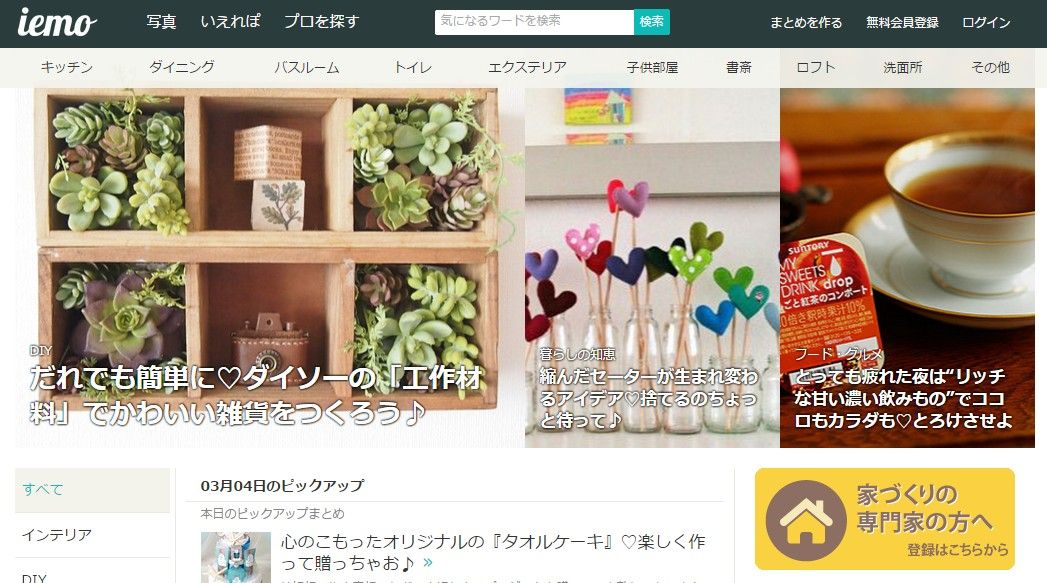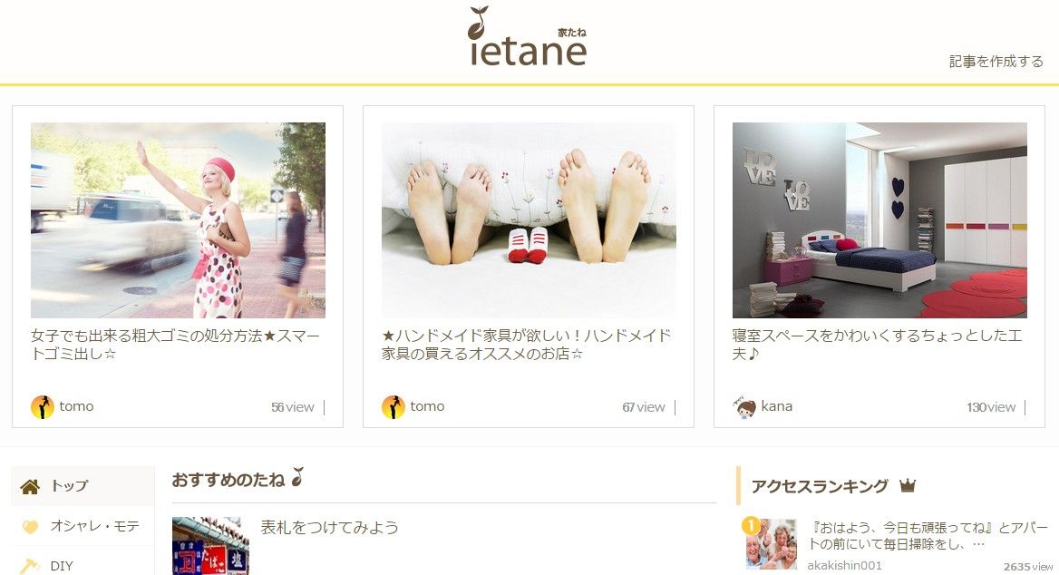 めちゃくちゃスッキリしてます。サイト名の通り、タネが散らばっている感じで、作りとしてキュレーションメディアっぽさを感じます。「あなたがふむふむするようなすまいのたねを、暮らしのエキスパート達がお届け」して頂けるようでして、”ふむふむ”したい方は必見。