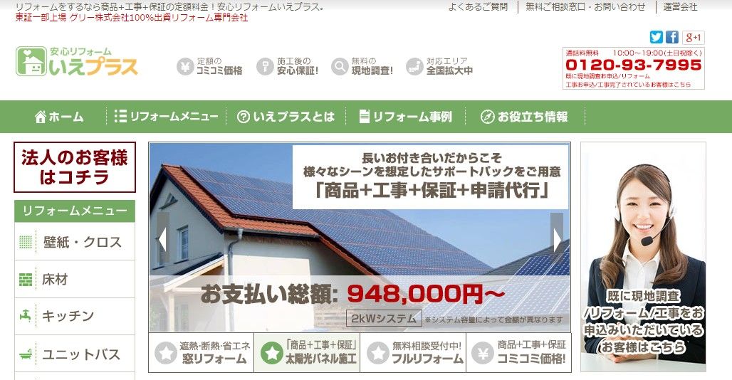 グリーの新規事業。業界初となるオンラインでの「商品+工事+メンテナンス保証5年間」のパッケージを提供。”東証一部上場 グリー株式会社100%出資リフォーム専門会社”が目を引きます。