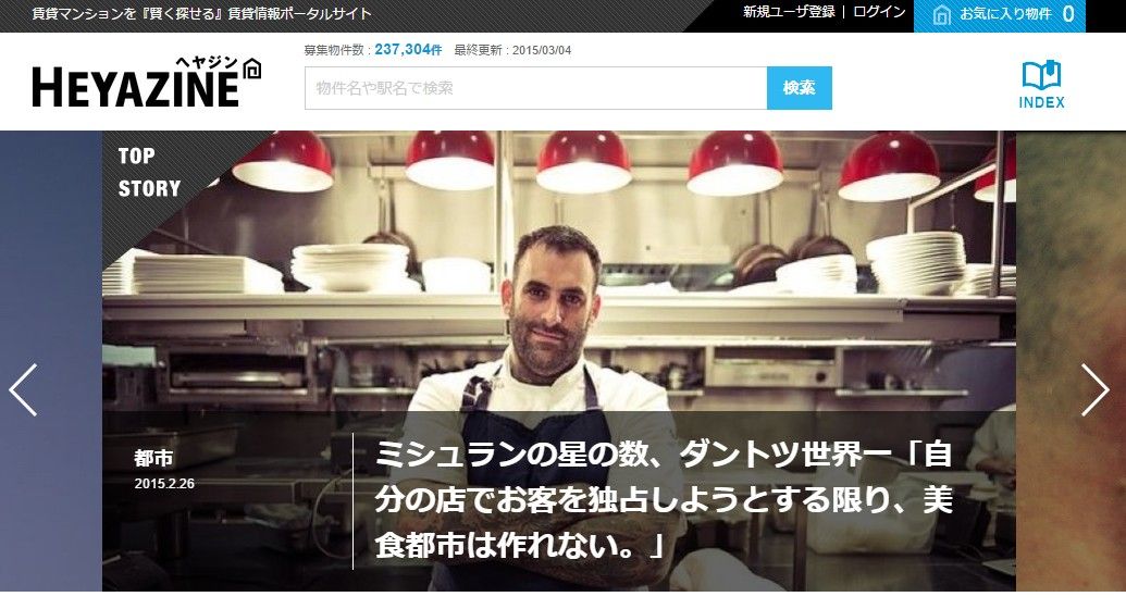 空室情報の大元である管理会社・元付会社からの情報掲載に限定した賃貸情報を掲載。ファーストビューは大きな画像が占める。記事内容としては海外のものが多い印象。全体的にスタイリッシュな作り。