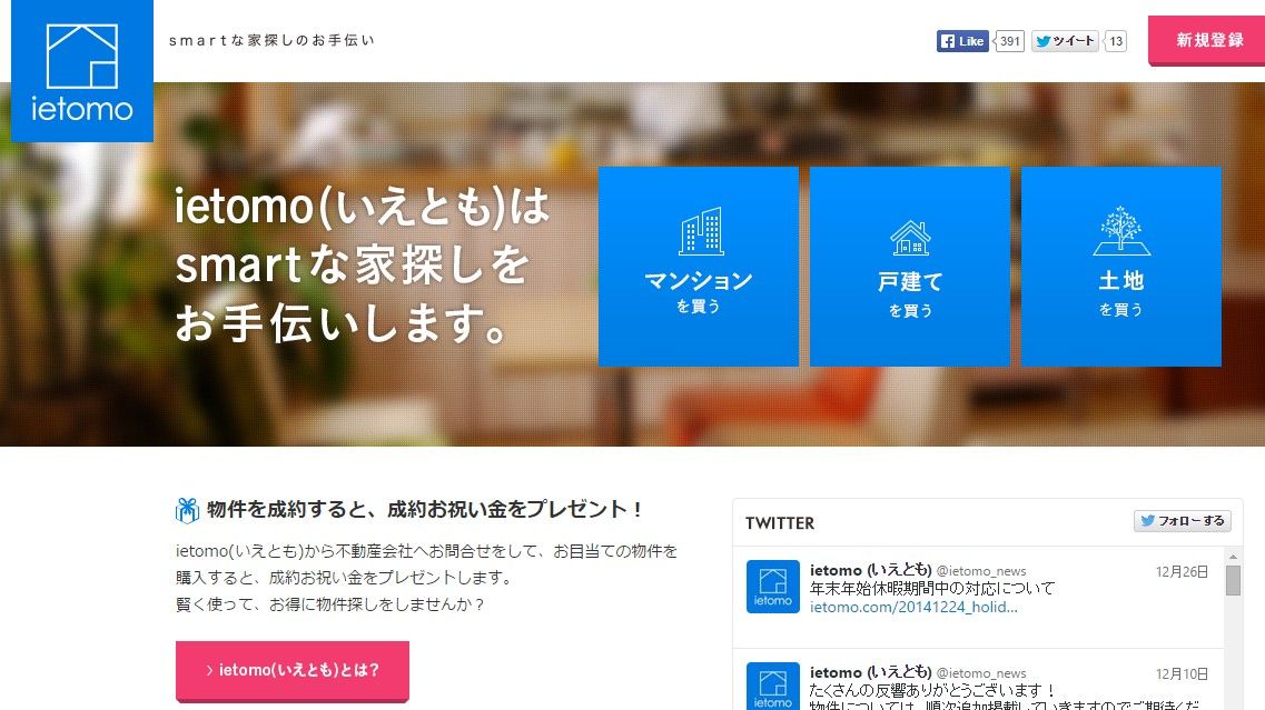 こちらもグリーの新規事業。物件価格に応じて成約祝い金3万円以上を贈呈する仕組みを採用。