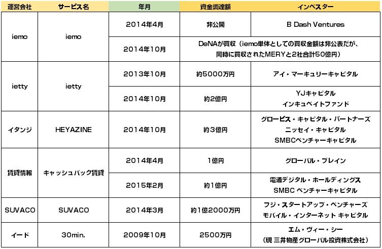 2013年頃から立ち上がってきたサービスも多く、VCにとっては注目の領域なのか2014年で資金調達のリリースは6件と増加しました。(特に2014年10月が多かったです) iettyや賃貸情報に関しては、2回の資金調達と活発に動かれております。