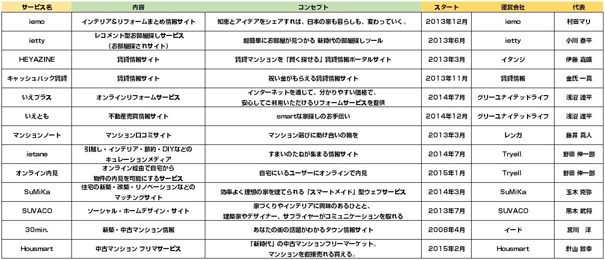 2013年くらいから盛り上がってきた感があり、昨年2014年も沢山のサービスが立ち上がりました。ジャンルで見ると様々ですね。賃貸情報サイトから、「レコメンド」や「まとめ情報サイト」「キュレーション」「マッチング」といった近年ネット系サービスでよく目にするワードもチラホラ。