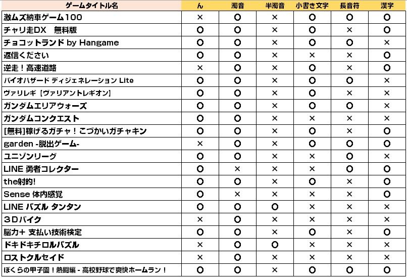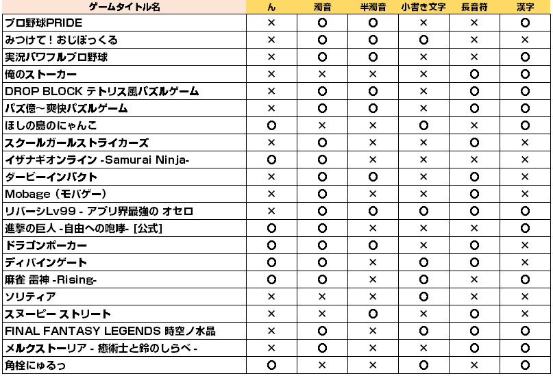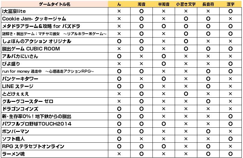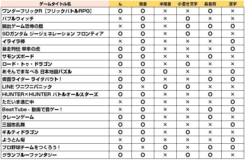 「特に”ん”と濁音を使う。「パズルアンドドラゴンズ」は、”ん”も濁音も半濁音も入ってる」という言葉に沿って、ゲームタイトルを調べてみたいと思います。その他として、小書き文字、長音符、漢字も含んでみます。