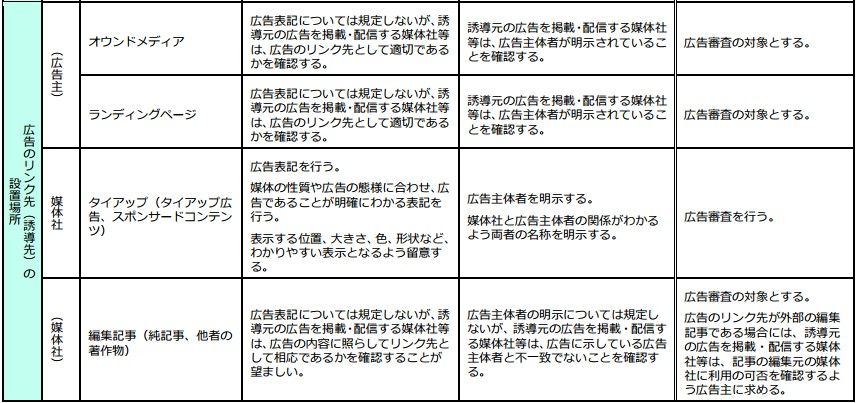 広告表記については規定なし。誘導元の広告掲載を行う媒体社等は、広告のリンク先として適切であるかを確認する。