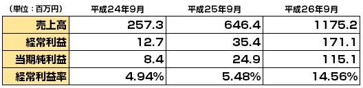 2012年~2014年3年間における業績推移です。2012年は2.5億だった売上は2014年には11.7億と10億円規模に成長。経常利益率も2014年には14.5%と大きく飛躍した模様。
