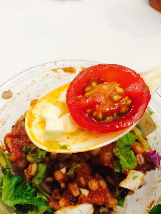 キャベツ、レタス、サニーレタス、玉ねぎ、紫キャベツ、紫玉ねぎ、オリーブ、トマト、パプリカ、チーズ。カップが意外と容量あるとはいえ、この種類はだいぶ攻めてます。混ぜて食べて頂いてももちろんOK。