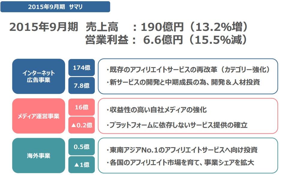 2013年9月には、アフィリエイトサービス「アクセストレード」のグローバル展開を開始。まずはインドネシアでのスタートでした。同年11月にはタイでも営業を開始し、東南アジアにおける事業展開を加速。2014年12月には、ベトナム最大級の広告ネットワークのMWORK社と資本業務提携し、ベトナムに進出。2015年5月には同社と合弁も設立し「アクセストレード」の展開を開始している。
