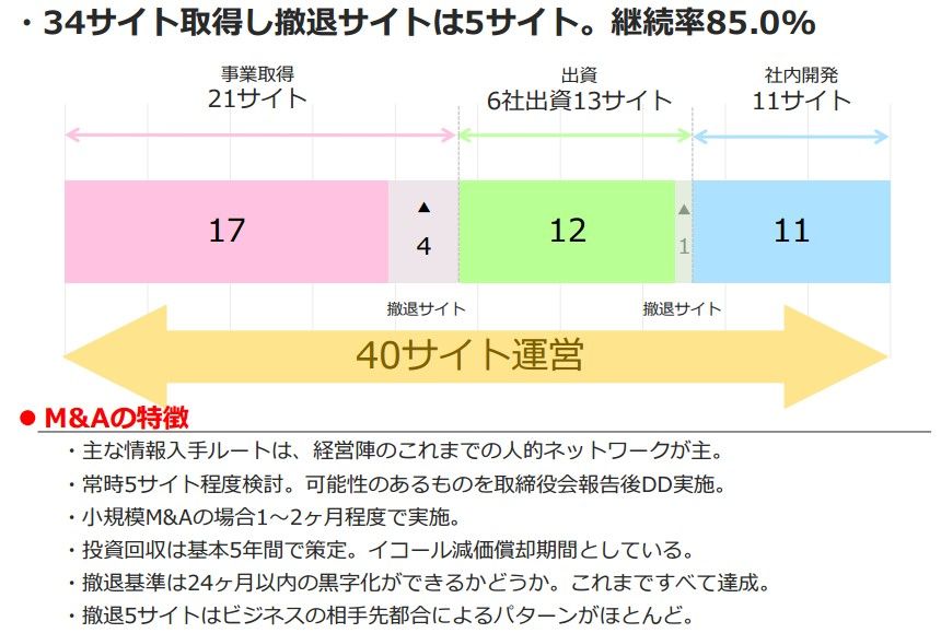 「小規模M&Aの場合は、1~2ヶ月程度で実施する」という早い意思決定と、「投資回収は基本5年間(=減価償却期間)、撤退基準は24ヶ月以内の黒字化」など、事業そのものの指標が明確になっているのも良い点なのではないでしょうか。