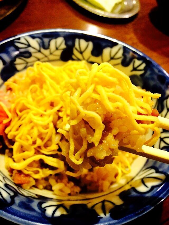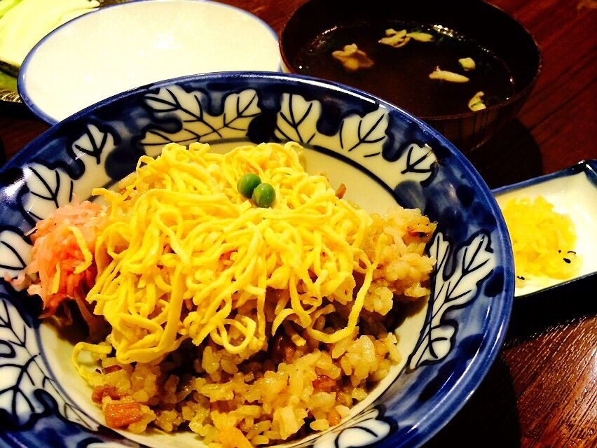はい、オープンtheとりめし。綺麗。錦糸卵がより一層の綺麗さを演出いたします。スープと漬物付き。
