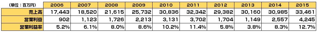 2011年のピーク時に37億円あった営利が2013年には11億円まで落ちるなど大きな落ち込みがありましたが、見事に立て直し、2015年42億円の営業利益を残し過去最高を更新しております。