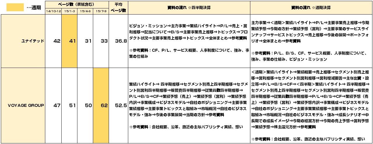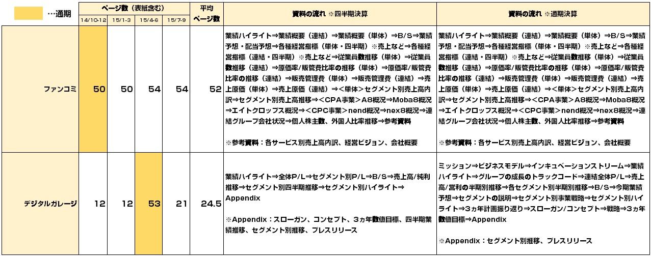 ちなみに、ページ数の多いVOYAGE GROUPは事業毎の説明が細かく、ファンコミは連結と単体それぞれでページを設けているためボリュームが多くなっております。
