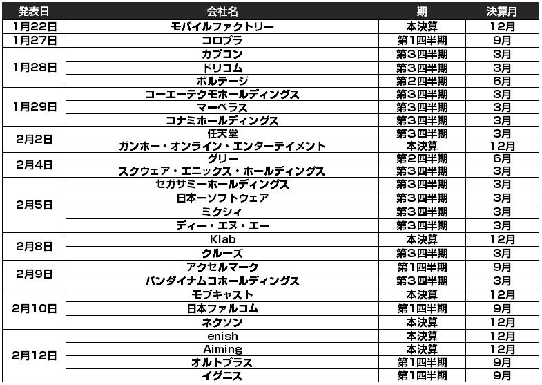 さてさて、決算シーズンです。まずゲーム関連企業の決算発表日をまとめておきます。1-2月で決算発表のあるゲーム会社になります。