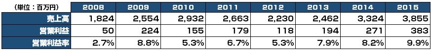 ここ8年の業績推移。2010年~2012年にかけてスマホ移行期により、売上が22億円まで低下。ただ、2013年に上昇傾向となって以降、3年連続の増収増益で、2015年12月期は売上:38億5,500万円/営利:3億8,300万円の着地。