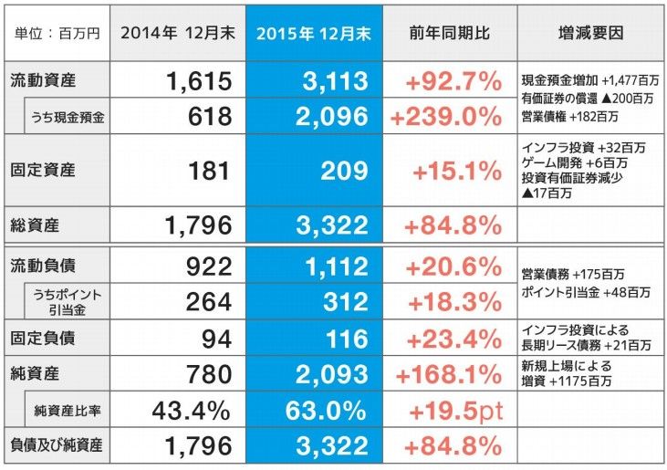 昨年10月のマザーズ上場による資金調達が11億7,500万円あり、純資産が20億9,300万円(前年同期比+168.1%)と大きく増加しております。これにより、新規投資も期待出来そうです。