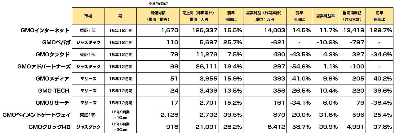 本体を含むGMOグループ各社の決算が一通り発表されております。9社上場しておりますので、数字だけいっぺんにまとめました。