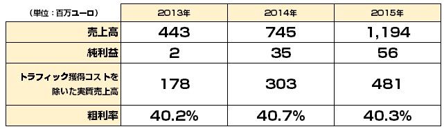 右肩成長が続いております。しばらくこの勢い続くんだろうなぁと思うくらいに好調。非常に安定した業績ではないでしょうか。売上高はQベースとしては、初の3億ユーロ超え。トラフィック獲得コストを除いた実質売上高(=粗利)および粗利率も、安定しております。