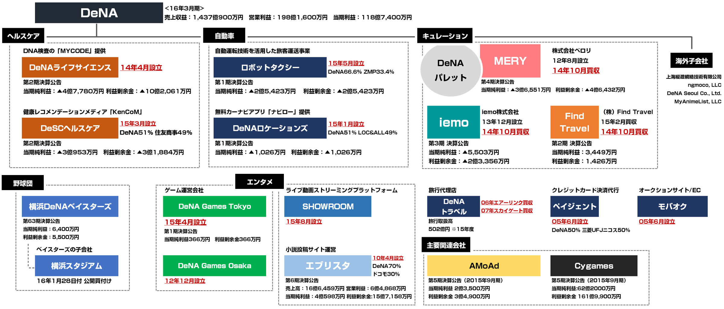 先日もキュレーションメディアについて書いたんですが、DeNAネタをもういっちょ。ここ数年、新規事業への投資が目立ち事業領域が拡大中のDeNAグループ全体を整理してみたいと思います。
