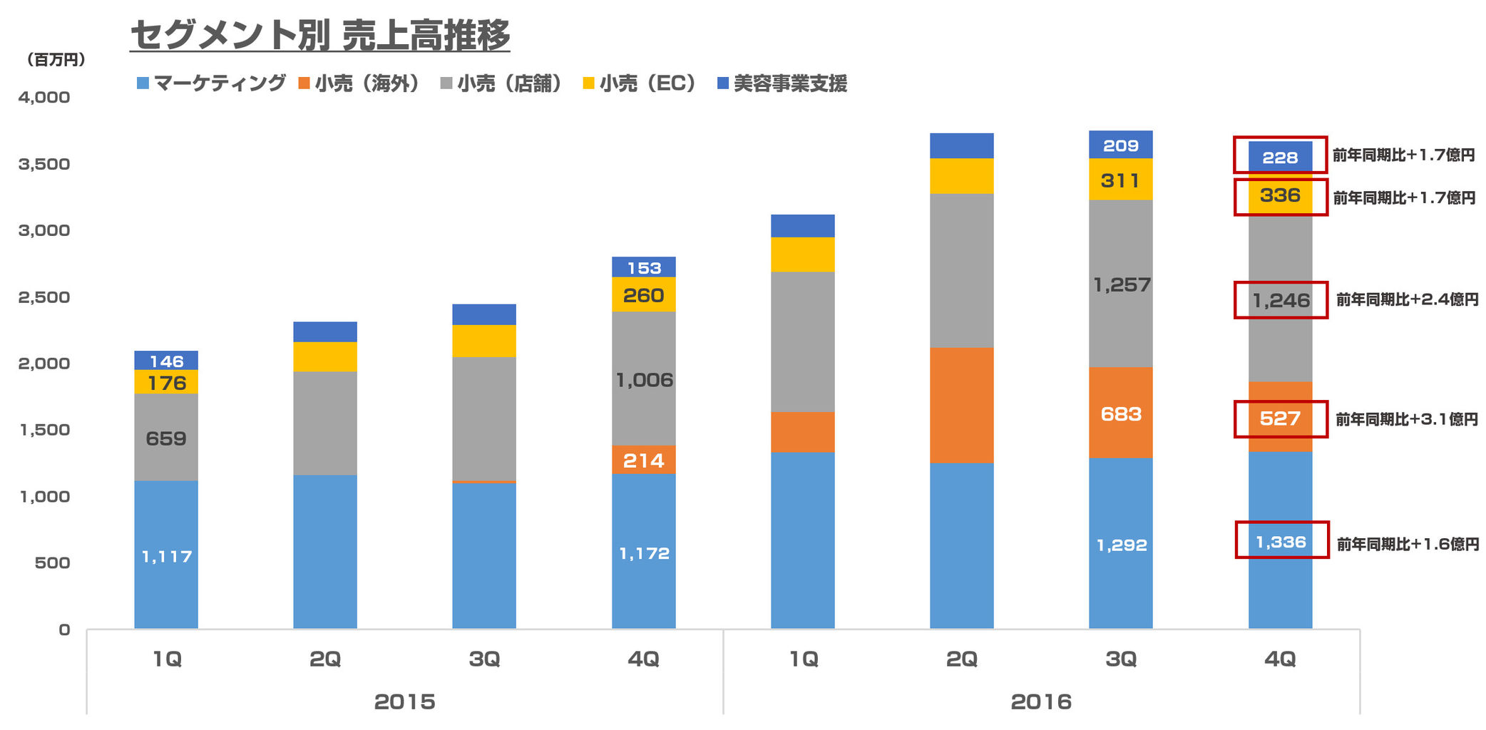 特に、国内店舗や海外向EC卸が好調。国内小売ビジネスの売上高が59億円と全売上高の40%以上を、海外ビジネスに関しては売上25億円まで成長し全売上高の17%以上を占めるまでとなっている。 マーケに関しても、課金売上は20億円と大きな定常収益となっている。