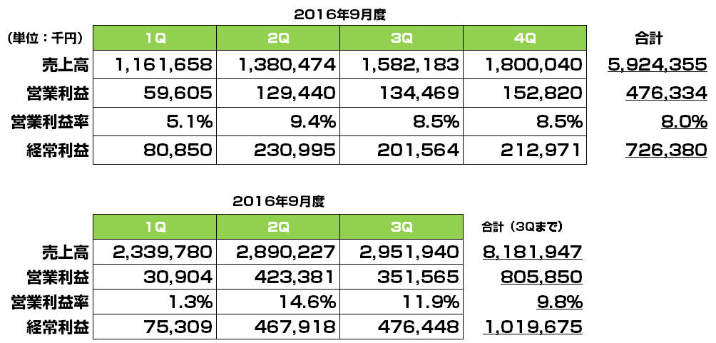 3Qまでの数字で今期と前期を比較すると、非常に伸びているのがわかります。売上は既に80億円を超えてきており、今期の着地売上予測は111億円。また、利益率も伸びているのが素敵ですね。今期1Qは下がりましたが、現状の推移ですと、12-13%が基準の営利率となりそうです。