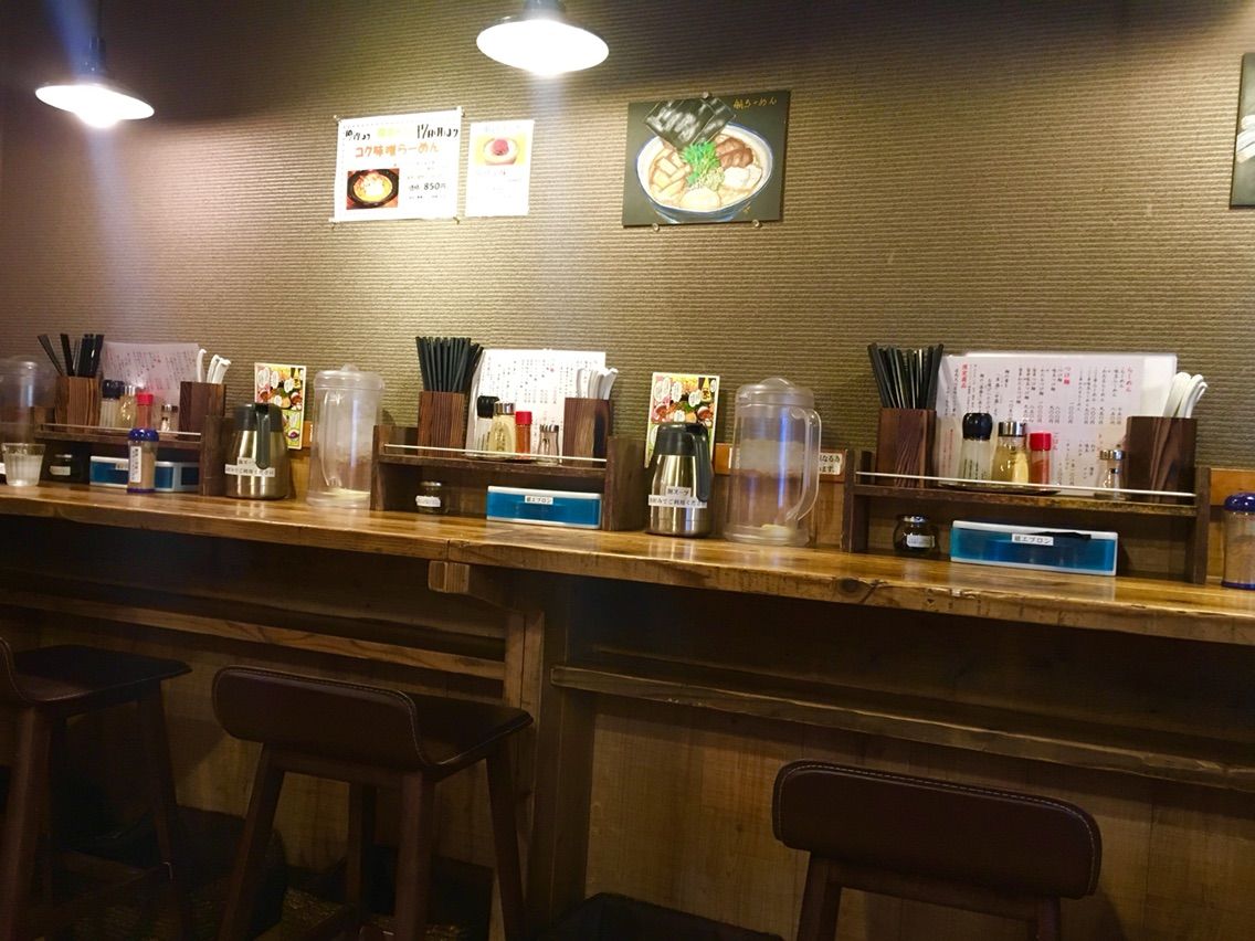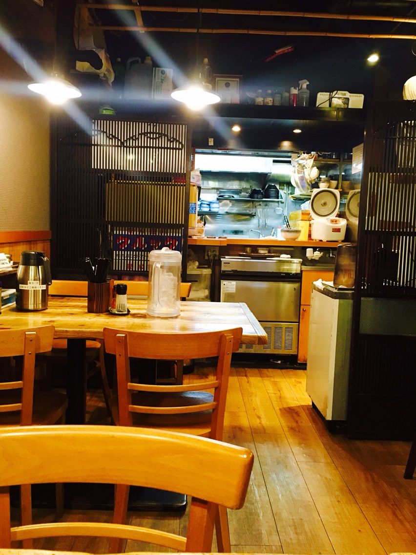 店内。4人掛けのテーブル席が2つ、あとは壁際にカウンター席が5つ?程度。