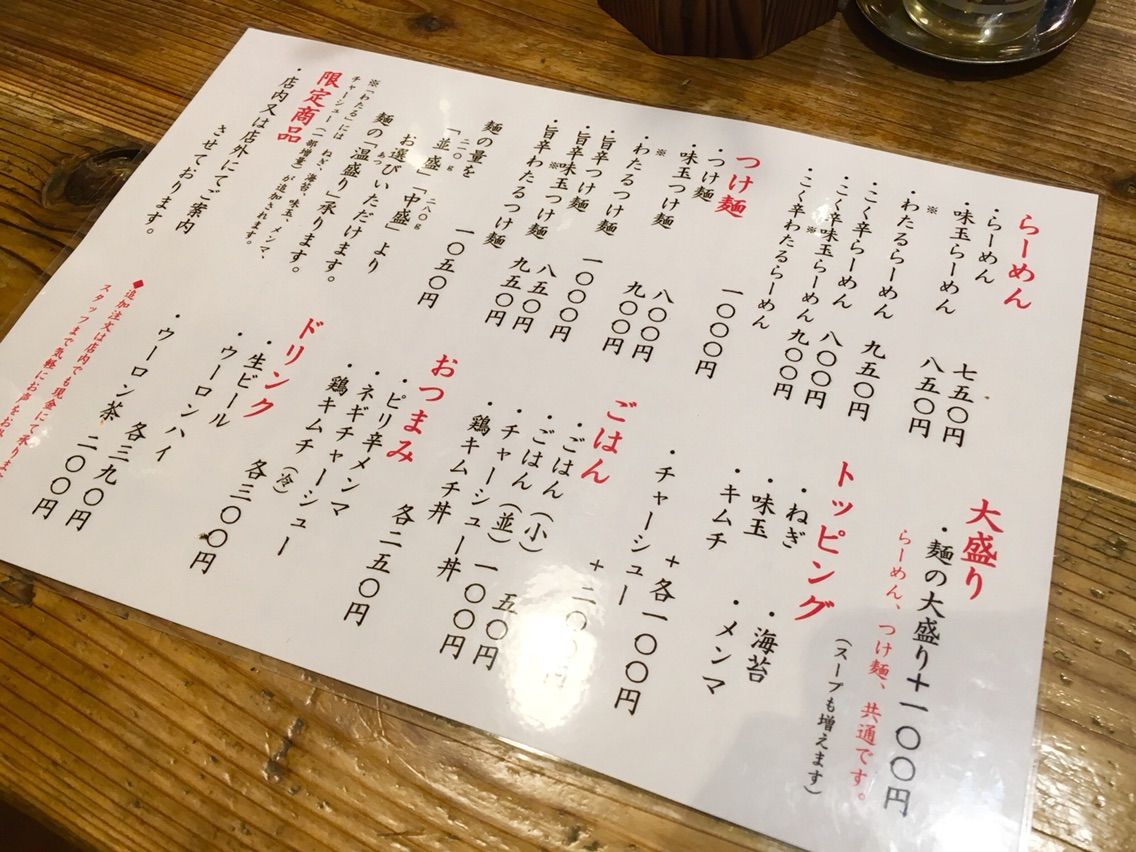 メニューです。「ラーメン」と「つけ麺」の2軸。あとは派生して、辛い系メニュー。限定の変わり種メニューなどもありましたので、適宜要チェックです。サイドメニューも少しあります。