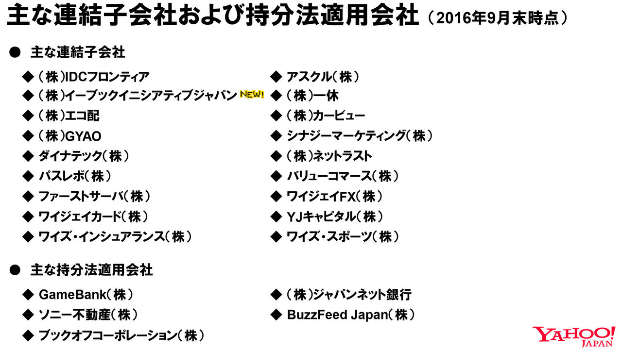 上記、ヤフーのグループにおける、ここ3年間の役職員数推移ですが、2016年度2Q末段階で、10,000人(10,964人)を突破しております。すごい。今年1月に会社設立20周年、今年4月に「Yahoo! JAPAN」開設20周年。約20年での10,000人達成となっております。積極的なM&Aもあり、2015年度2Q(2015年7-9月)から大きく増加しているのがわかります。