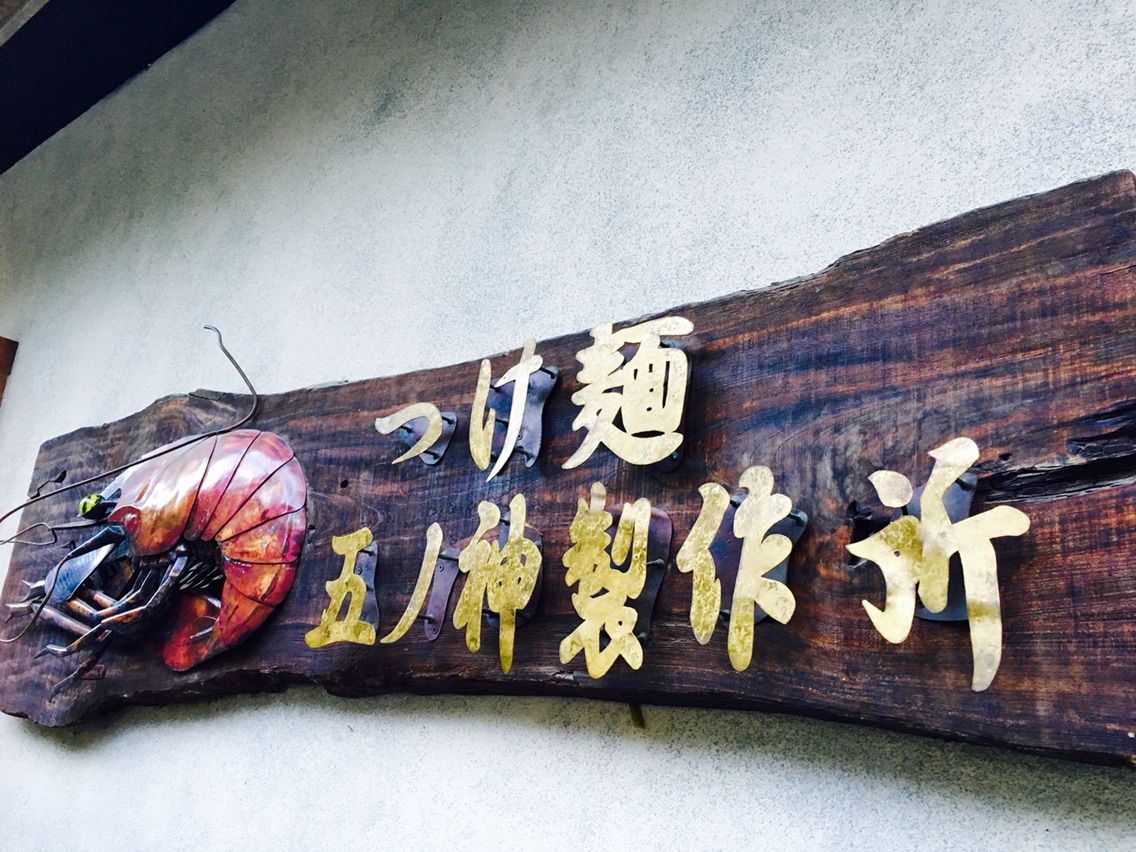 「つけ麺 五ノ神製作所」。この海老が目印。はい、ということで海老で出汁を取った海老つけ麺です。ちなみに、並びます。夕方でも普通に並びあるのでご認識の程よろしくお願いします。