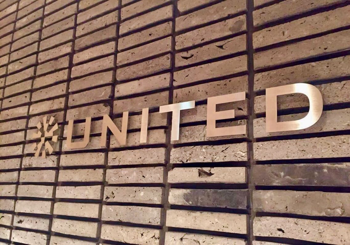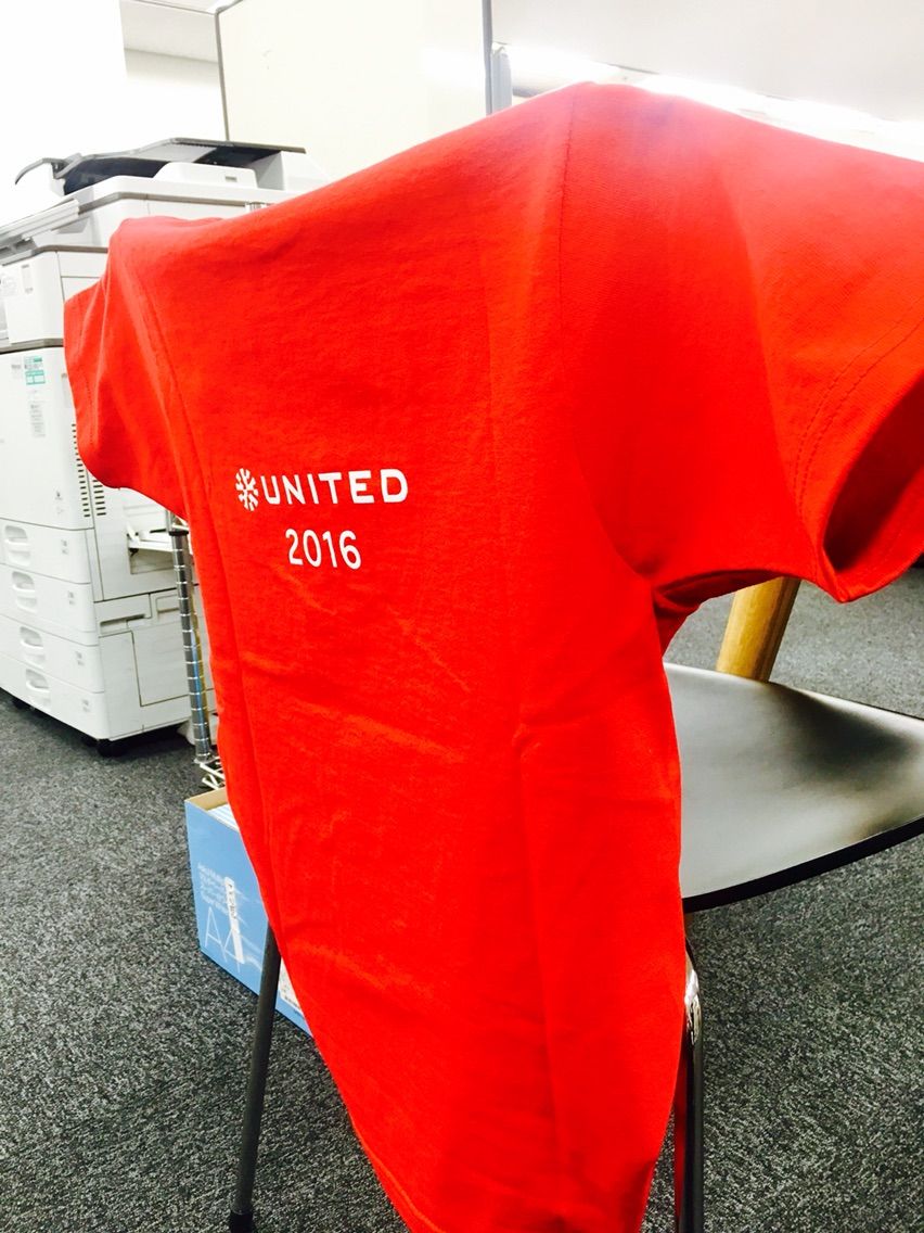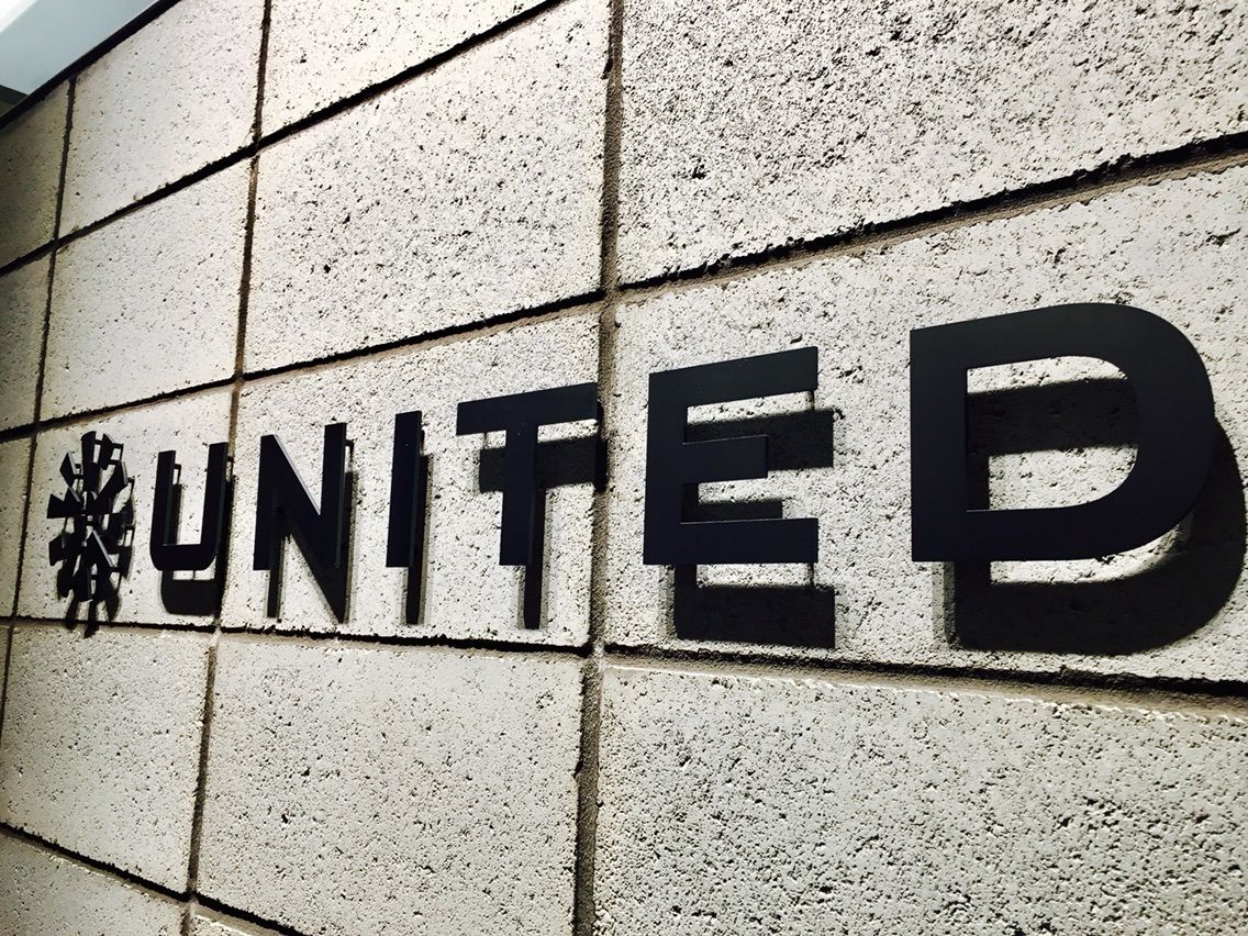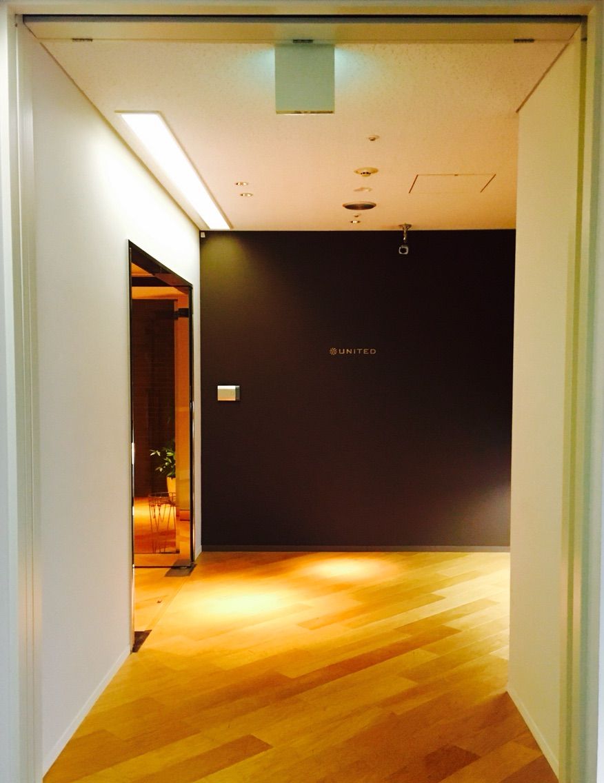 エレベーターを降りて進んでいきますと、ロゴが見えてまいりました。視力良くないと見えないですが、ユナイテッドだと思います。