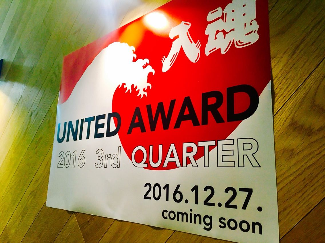 本の前には、ポスターが。ユナイテッドアワード、社内の3Q表彰でしょうか。スローガンの「入魂」の文字も。個人的にこの色合い好きです。