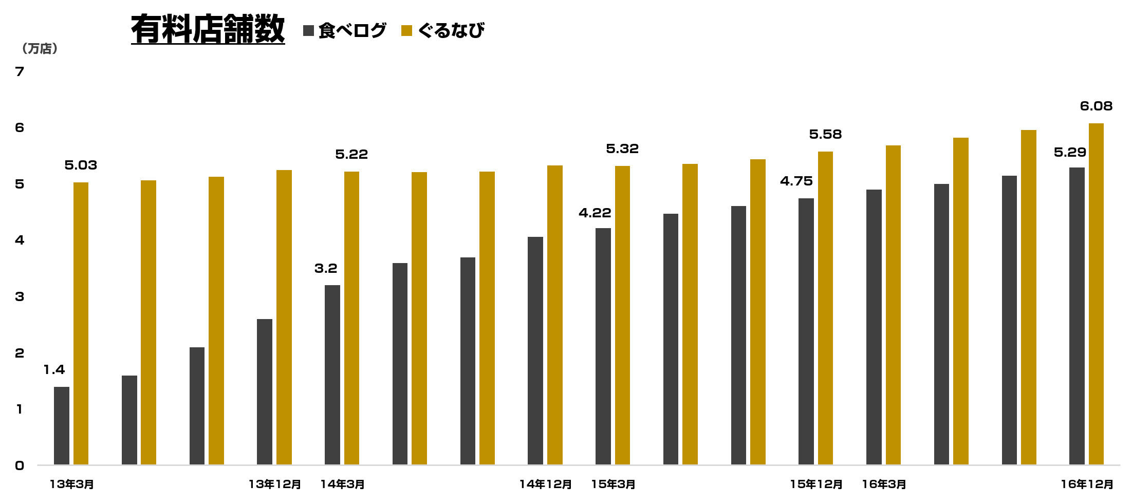 有料店舗数は、ぐるなびが6万店を突破。食べログも5.2万店と追いかけております。