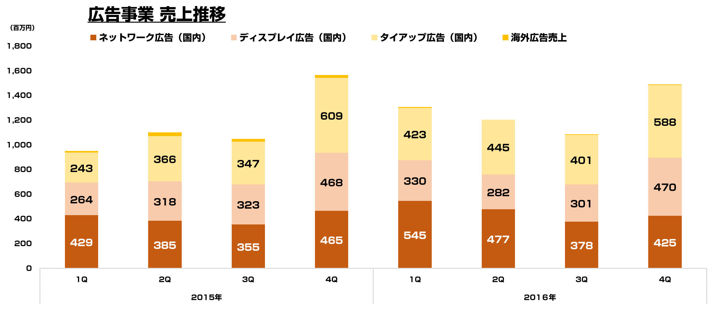 次に広告事業。通期ベースで前年から伸びを見せておりますが、Q対比でみるとほぼ横ばいとなっております。シェアとしては引き続きタイアップ広告(国内)が多い状況です。