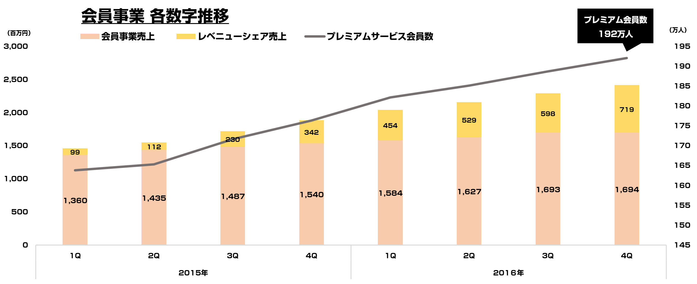 会員事業は、レベニューシェア売上の増加が著しく 直近Qで約7億円の売上。これは主にドコモとの協業「dグルメ」の数字かと思われますが、早々に10億円/Qに到達しそうです。その他、本体のプレミアム会員も引き続き増加しております。