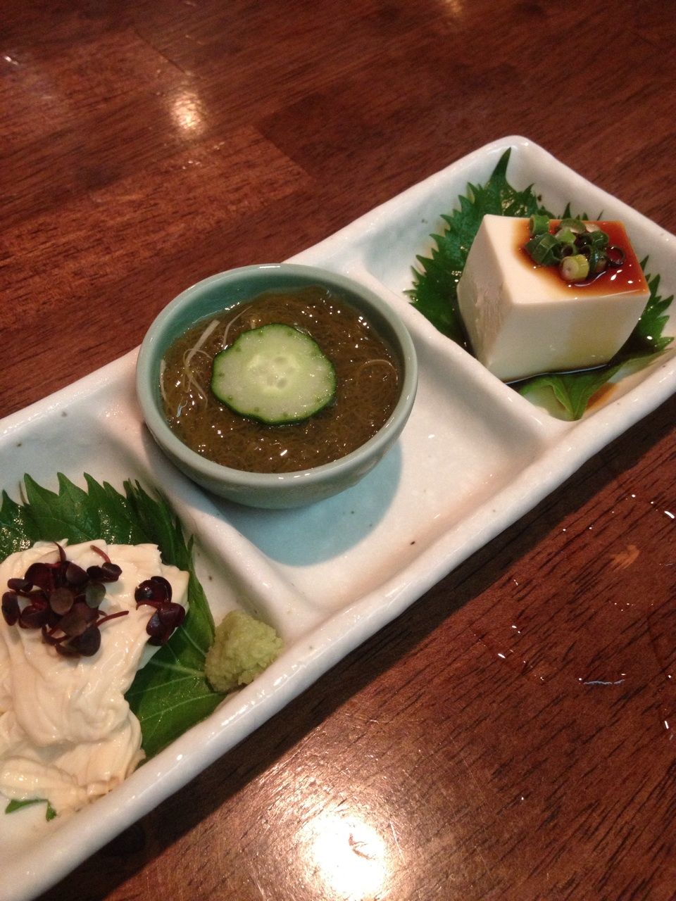 能登産絹もずく、汲み上げ湯葉と京豆腐の前菜三点盛り