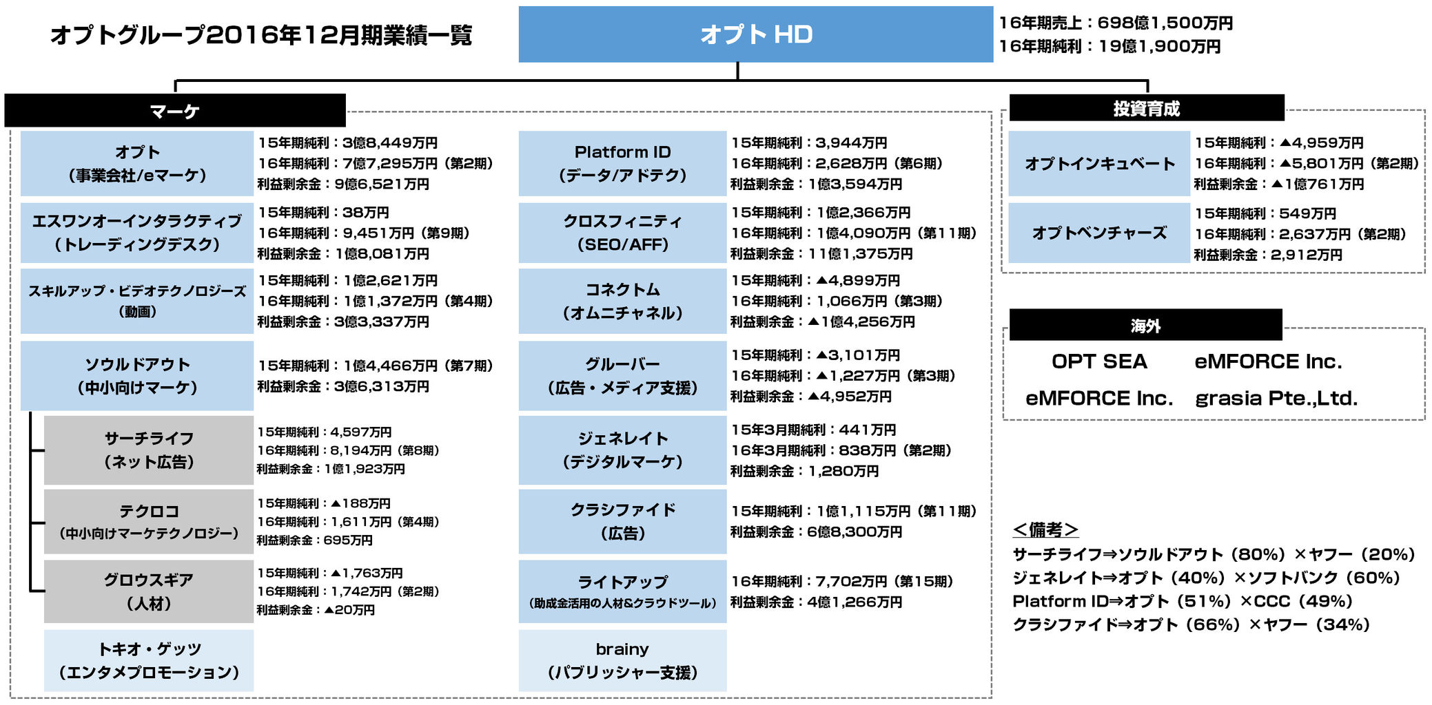 事業としては「マーケティング」「投資育成」「海外」の3つに分かれているオプト。ここ2、3年で子会社も増えてきており守備範囲も広くなっているものと思われます。