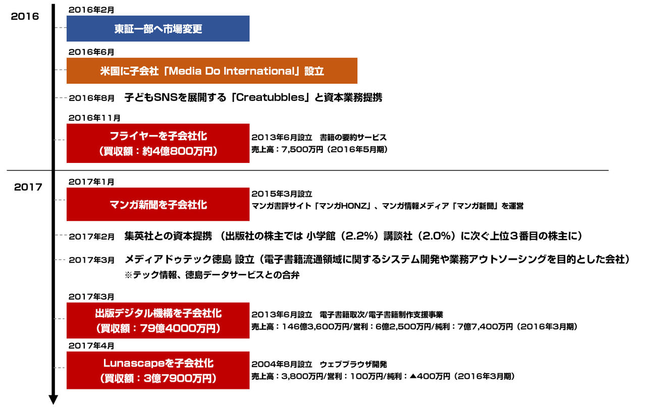先日、ウェブブラウザ開発の「Lunascape」の買収を発表しておりますが、先月には、電子書籍取次の「出版デジタル機構」を買収しております。加えて1月には、メディア運営の「マンガ新聞」を買収しており、今年に入ってから3社目の買収と ハイペースでグループが拡大しております。