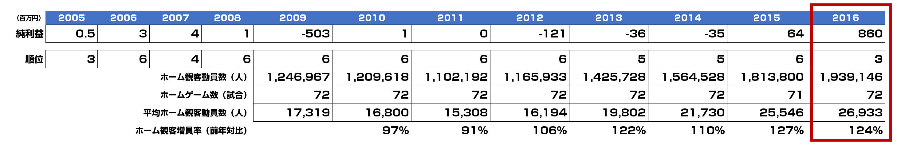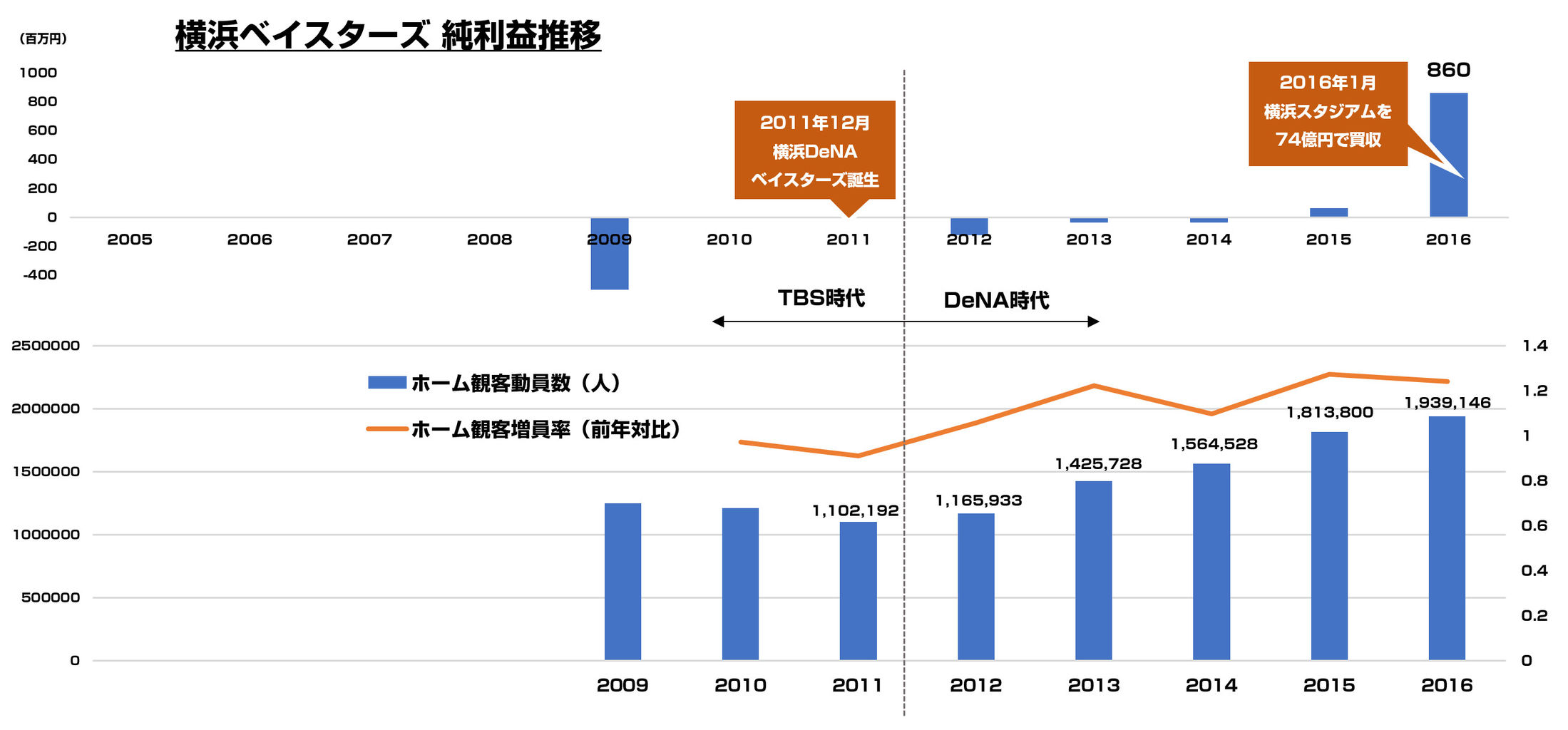 2011年12月にDeNAがTBSから約65億円でべイスターズの株式を取得しましたが、その時は利益が出ていない状況でした。しかし、4年後の2015年に改めて黒字化し、DeNA時代5年目の2016年に8.6億円の大幅増益を達成する流れとなっております。2015年まで順位も低迷気味でしたが、昨年は3位に入りファイナルステージ進出も決めるなど躍進。そうした躍進も大幅増益に繋がった要因の一つだと思われます。