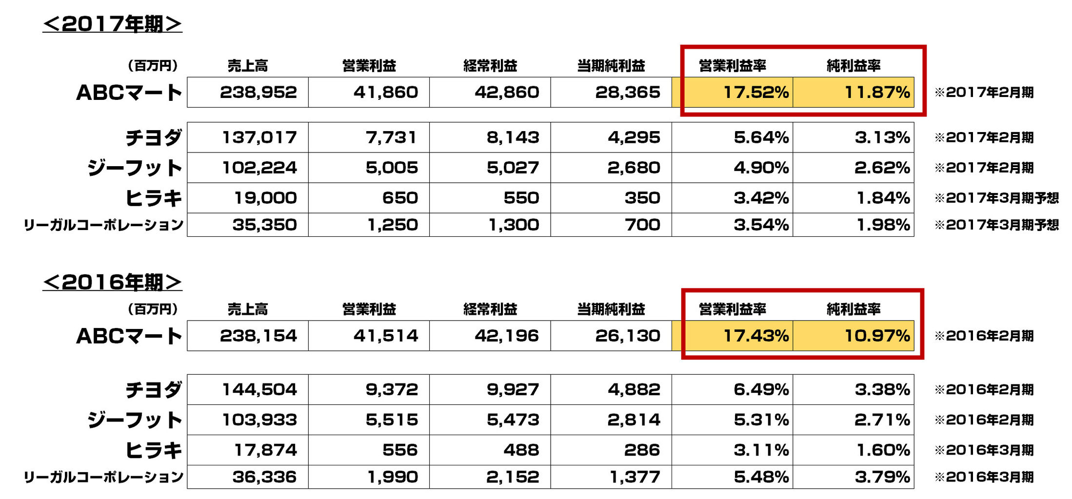 直近2期分の業績になりますが、他社の営利率3~5%に対し、ABCマートは営業利益率で17.5%と相変わらずの高利益率っぷりを誇っております。