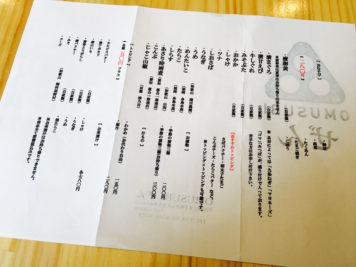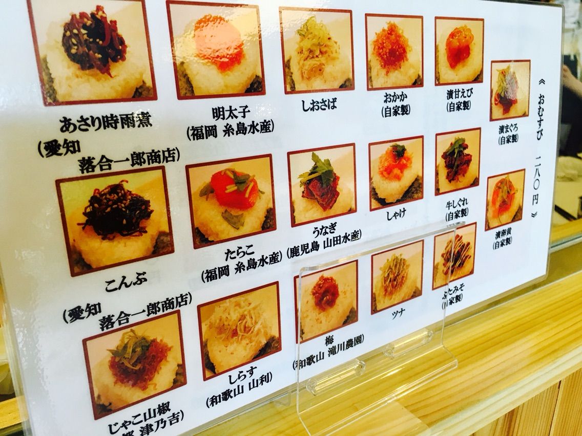 おむすびは全部で17種類!全て280円/個。味噌汁、おしんこ等サイドメニューもありますし、お茶漬けだってあります。