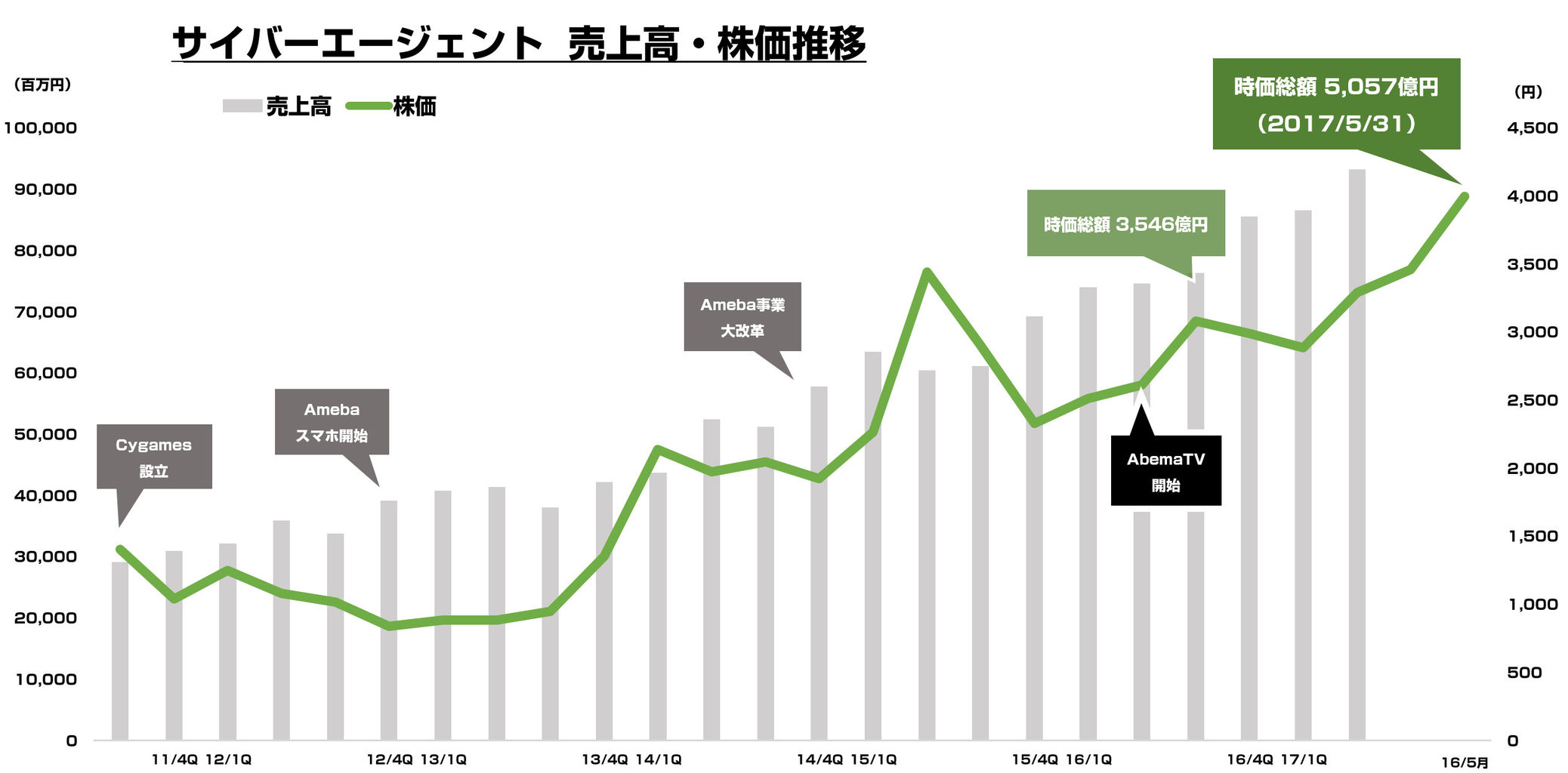 昨年の8月末で3,546億円でしたので、約9ヵ月で+約1,500億円程度積み上げてきております。業績については、先日書いた通りで引き続き好調を維持しております。注目のAbemaTVは、直近では亀田興毅さんのボクシング企画が非常に話題になりましたね。様々な視点から見ても各事業において調子が良く、株価上昇の要因となっているものと思われます。