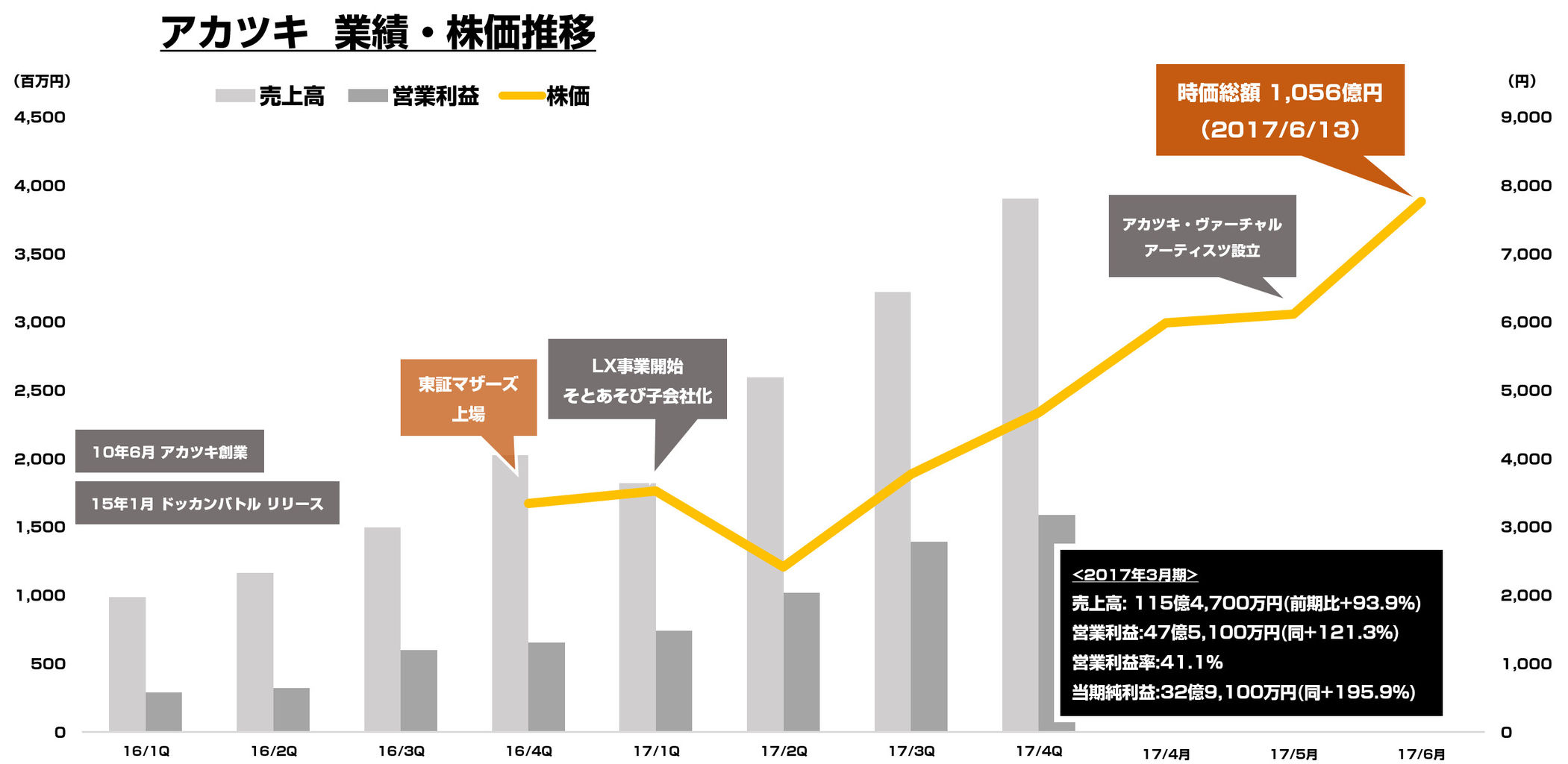 業績も好調で、17年3月期通期は 売上115億4,700万円(前期比+93.9%)/営利47億5,100万円(同+121.3%)と大きく伸長。「ドラゴンボールZ ドッカンバトル」が特に好調で、毎Q右肩成長を続けております。ライブエクスペリエンス事業やバーチャルアーティスト関連事業も新たに始まり、第2第3の柱に期待したいと思います。どこまで伸ばしてくるか、業績も株価にも注目です。