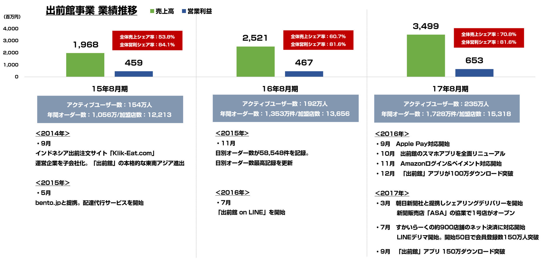 図でもわかる通り、特にこの1年はTOPIXの多い1年だったように思えます。16年12月には朝日新聞社と提携し、シェアリングデリバリーによる出前を開始、今後も拠点が増えることが予想され益々の発展が期待されます。2016年7月のLINEとの業務提携による「出前館 on LINE」、今年7月の「LINEデリマ」開始も大きく寄与しているかと思われます。