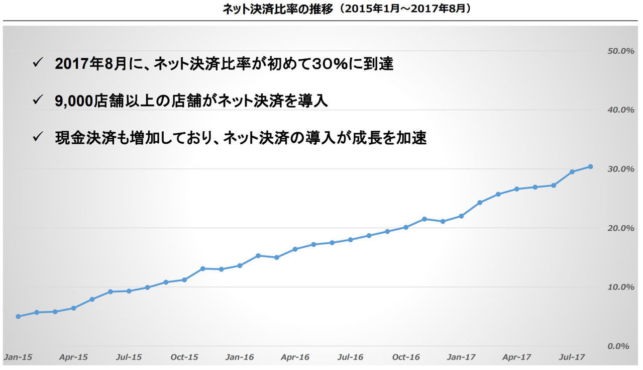 また、出前館では9,000店舗以上の店舗がネット決済を導入、2017年8月にネット決済比率が初めて30%に到達するなど、ネット決済も加速の一因と見られます。
