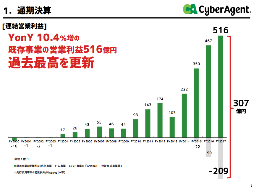 最後に全体業績を。全体売上としては3713億円。グラフの伸びがその好調ぶりを表しているかと思います。投資はAbemaTVを中心に209億円。先行投資額のグラフも伸びていて、今期もまだまだ投資が続きます。とはいえ、大きな利益をしっかりと残してくるあたり流石ですね。今日はこの辺で。ではまた。