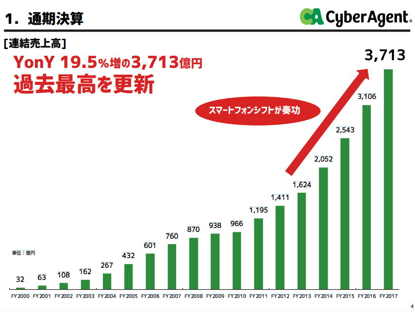 通期ですとスマホ率78%ですが、Qベースだとスマホ比率80%超えですので、比率は益々高まっております。上記推移を見ても、ずっと右肩成長で、4Q単体としては売上高:446億円で過去最高。