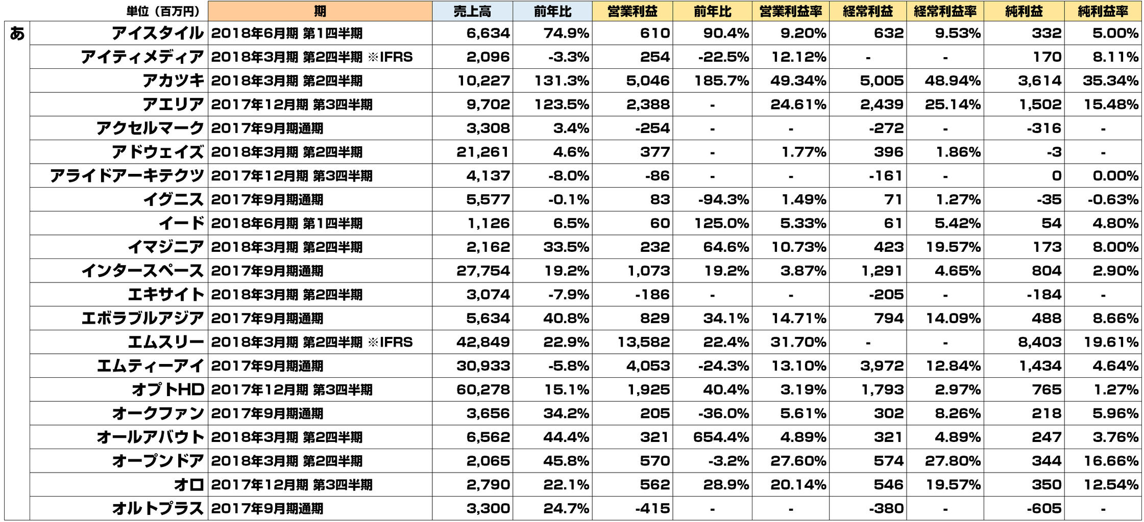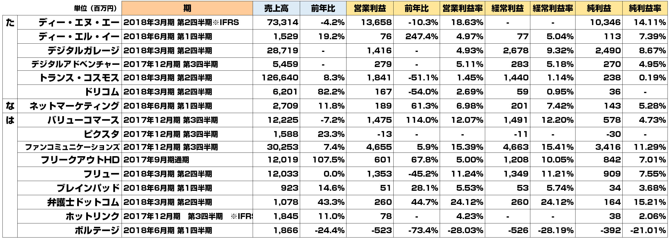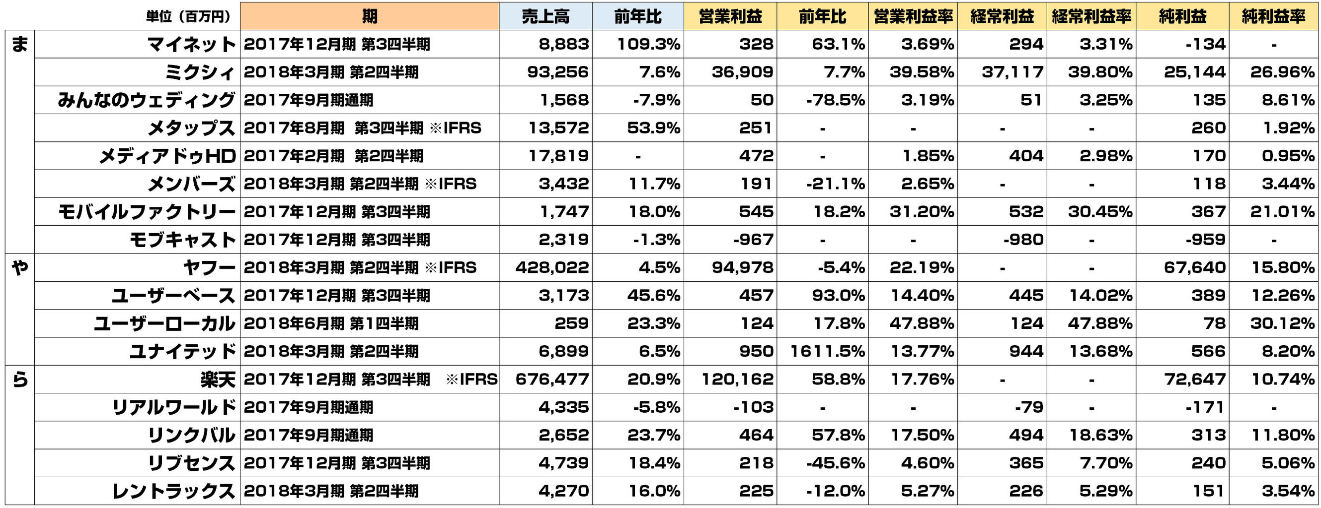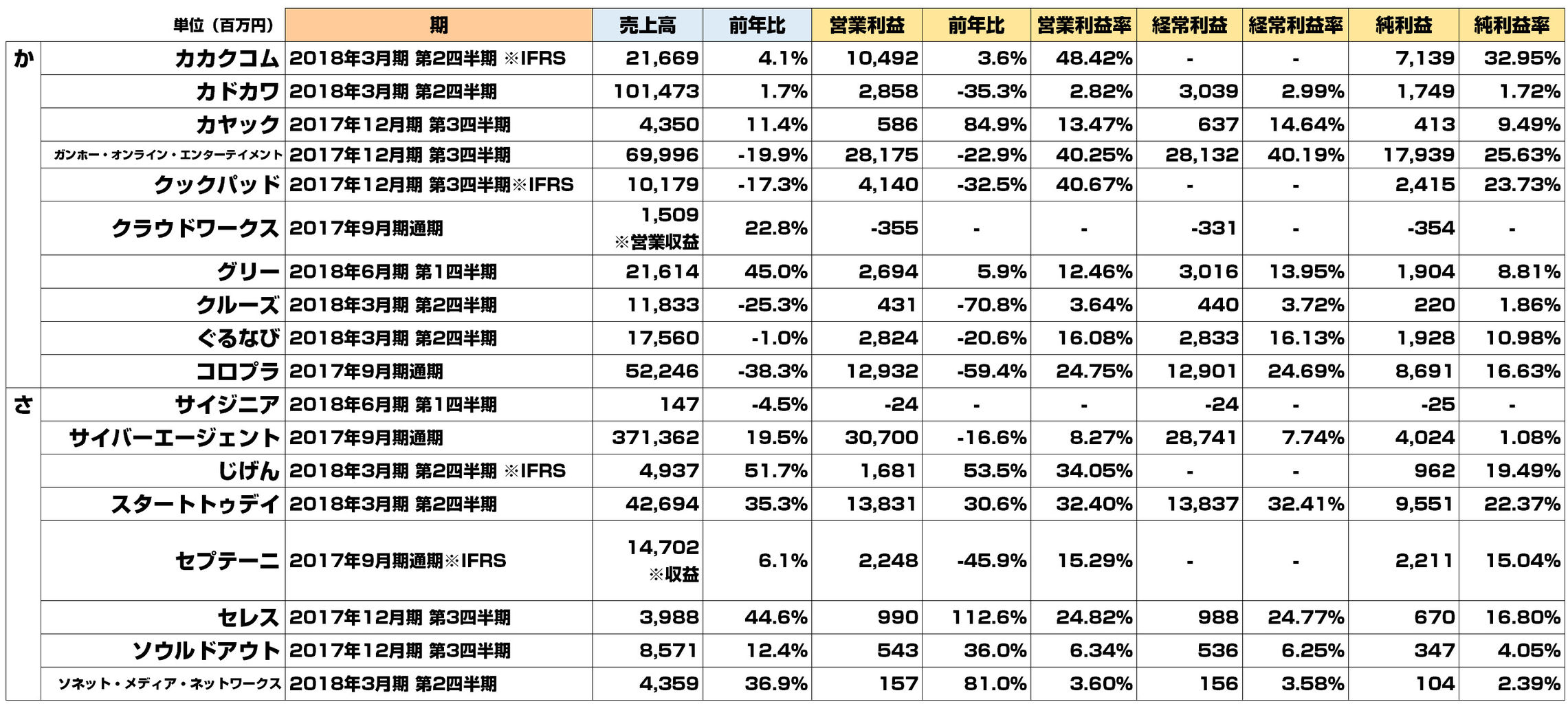 本格的に寒くなってきましたが、17年7-9月の決算発表ラッシュも終わりまして、いつもの定期エントリーを。10-11月で発表されたネット系企業の決算を一覧化しております。全90社です。
